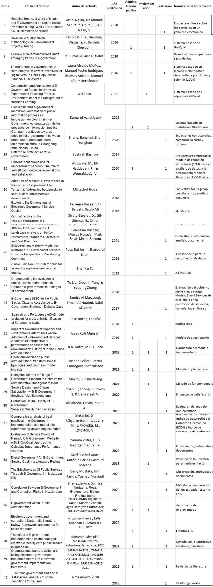 Finalmente, los estudios con la identificación de las herramientas para la implementación y evaluación de gobierno electrónico, considerando el título del artículo, nombre del autor, su incidencia en la administración pública y las herramientas aplicadas se muestran en la tabla 4.