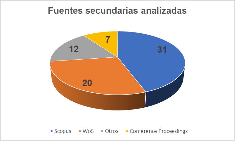 Por otro lado, se identificó las fuentes que fueron consultadas donde se destacó que la mayor parte de artículos pertenece a Scopus, seguido de WoS y en la sección otros un reducido número de artículos de otras bases de datos, como se muestra en la figura 3.