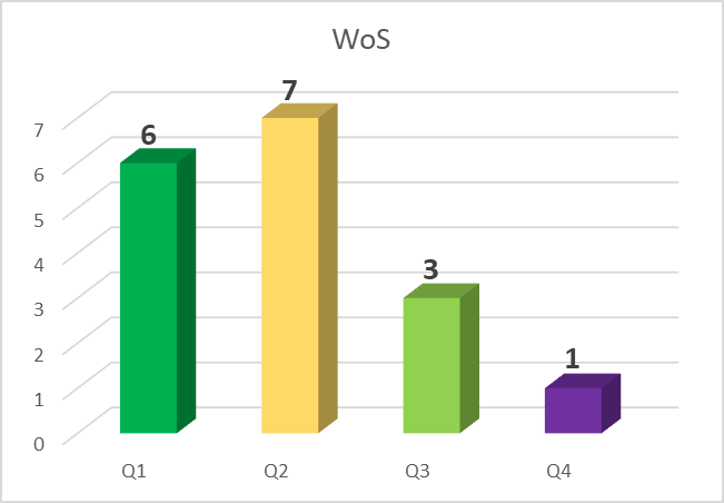 Finalmente, se presentan los hallazgos respecto a los artículos identificados en WoS y la posición de las revistas a nivel de cuartiles. Se destaca que la mayor parte se encuentra entre el cuartil 1 y 2 como se muestra en la figura 5.