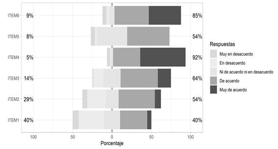 En cuanto a la experiencia de los profesores durante su trabajo en pandemia, las respuestas de los participantes mostraron una percepción general positiva sobre su capacidad para desarrollar adecuadamente clases virtuales, con un promedio de los seis ítems de .=3.79 (DS=0.65). Aparece con una menor puntuación el ítem 1 “Durante las clases y/o actividades no presenciales/virtuales, he sido capaz de entregar los mismos contenidos que en las clases o actividades presenciales” (.=2.97, DS=1.09). Figura 2 muestra detalle de respuestas.