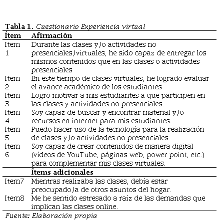 Cuestionario de Experiencia Virtual (de elaboración propia): Cuestionario diseñado a partir de publicaciones previas con la misma población (CIAE, 2020; Educar Chile, 2020; Elige educar, 2020), para explorar la autopercepción de los participantes sobre su experiencia impartiendo clases virtuales. El cuestionario constó de seis afirmaciones con temáticas específicas del desempeño pedagógico en pandemia, además de dos ítems que abordan aspectos de estrés y demandas del hogar (ver Tabla 1). Las preguntas se organizaron en escala Likert de cinco puntos (1= ‘Muy en desacuerdo’, hasta 5= ‘Muy de acuerdo’). La consistencia interna del cuestionario se valoró utilizando el coeficiente omega de McDonald obteniendo un ω = .712, lo que indica un nivel aceptable de confiabilidad.