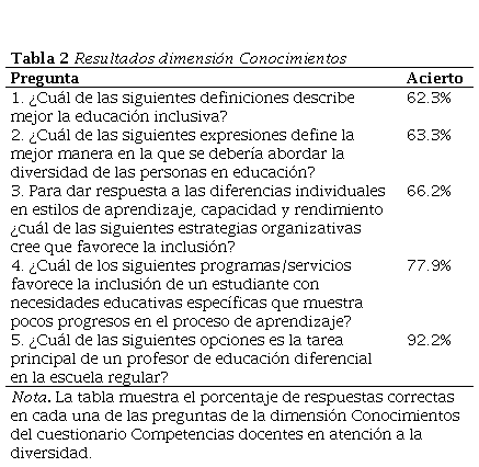En cuanto a la dimensión de Conocimientos el puntaje promedio fue de .=3.62(DS=1.05). Se identificó un alto porcentaje de acierto en la pregunta final, referida a conocer el rol del profesor de educación diferencial, y un acierto superior al 60% en el resto de las preguntas (Tabla 2).
