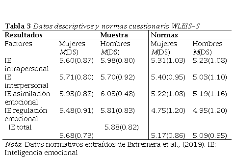 La consistencia interna fue excelente en la escala de inteligencia emocional WLEIS-S (. = .911). La Tabla 3 presenta los resultados descriptivos del cuestionario junto a los datos normativos según género. En cada dimensión se aprecia que los participantes obtuvieron puntajes promedio acorde a las medias normativas (Extremera et al., 2019).