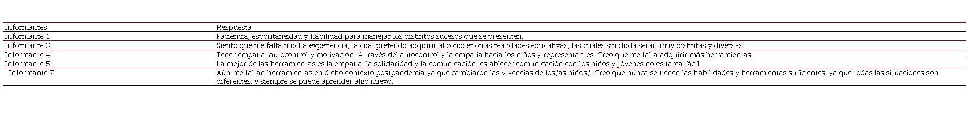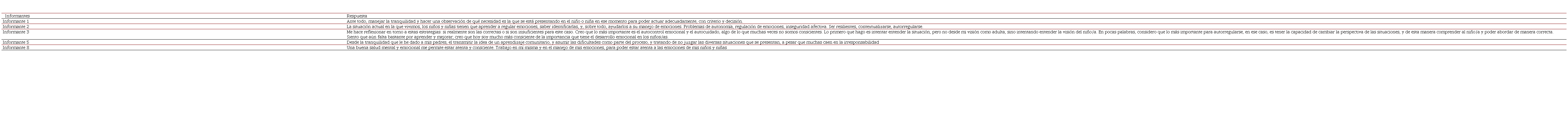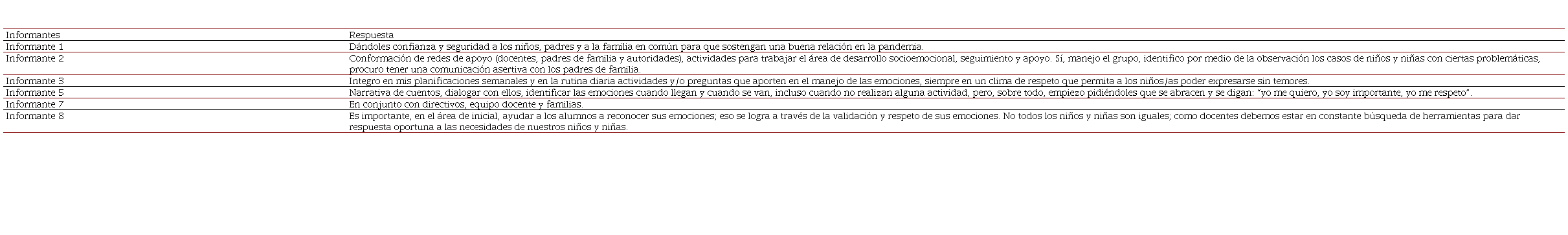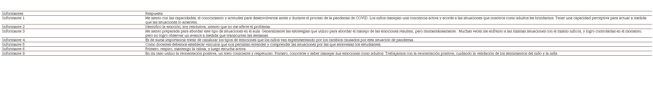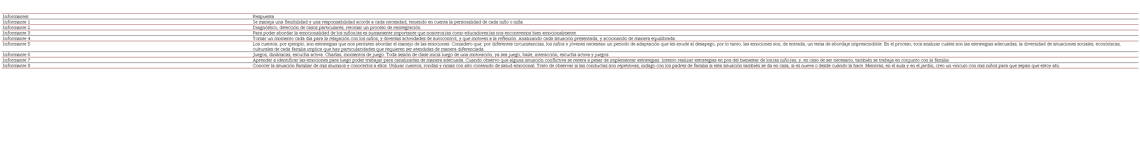 Los resultados de esta investigación demuestran que, a través de las opiniones de los informantes, se desprenden desde las Categorías Manejo de Emociones e Interacciones de Calidad las subcategorías: abordaje emocional, gestión emocional, herramientas emocionales, ambientes responsivos, formación docente, y autorregulación.