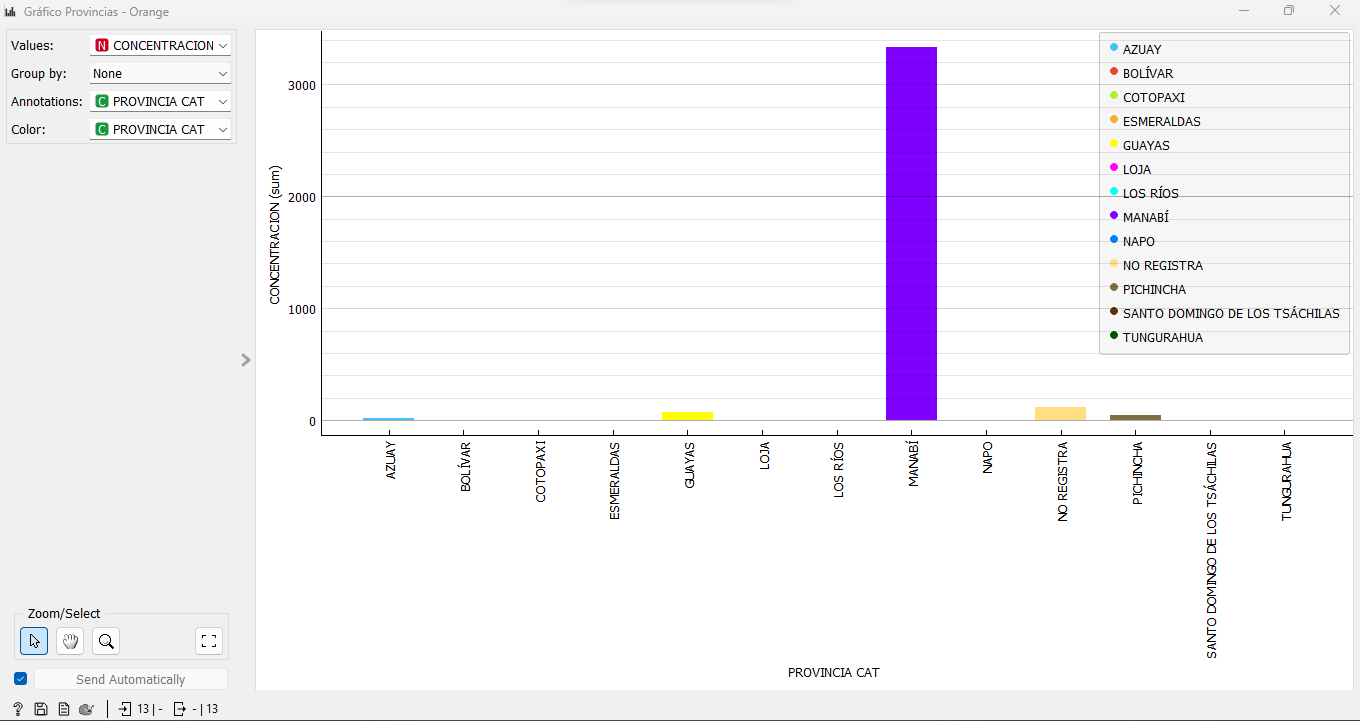 La ubicación geográfica también juega un papel importante al momento de realizar predicciones mediante software de minería de datos, por ello, se tomaron los datos correspondientes a las provincias, nótese que la provincia de Manabí es la que aparece con la mayor cantidad de casos: