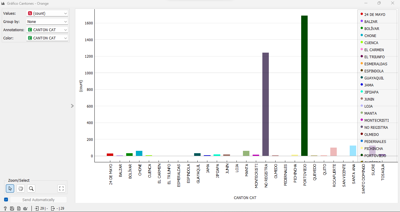 Al identificar que la provincia con mayor cantidad de casos fue Manabí, se decidió revisar el comportamiento por cantones, en donde se puede observar que la mayor concentración de casos COVID-19 se encuentra en el cantón Portoviejo, registrando más de 1600 casos. La figura 4, muestra este análisis:
