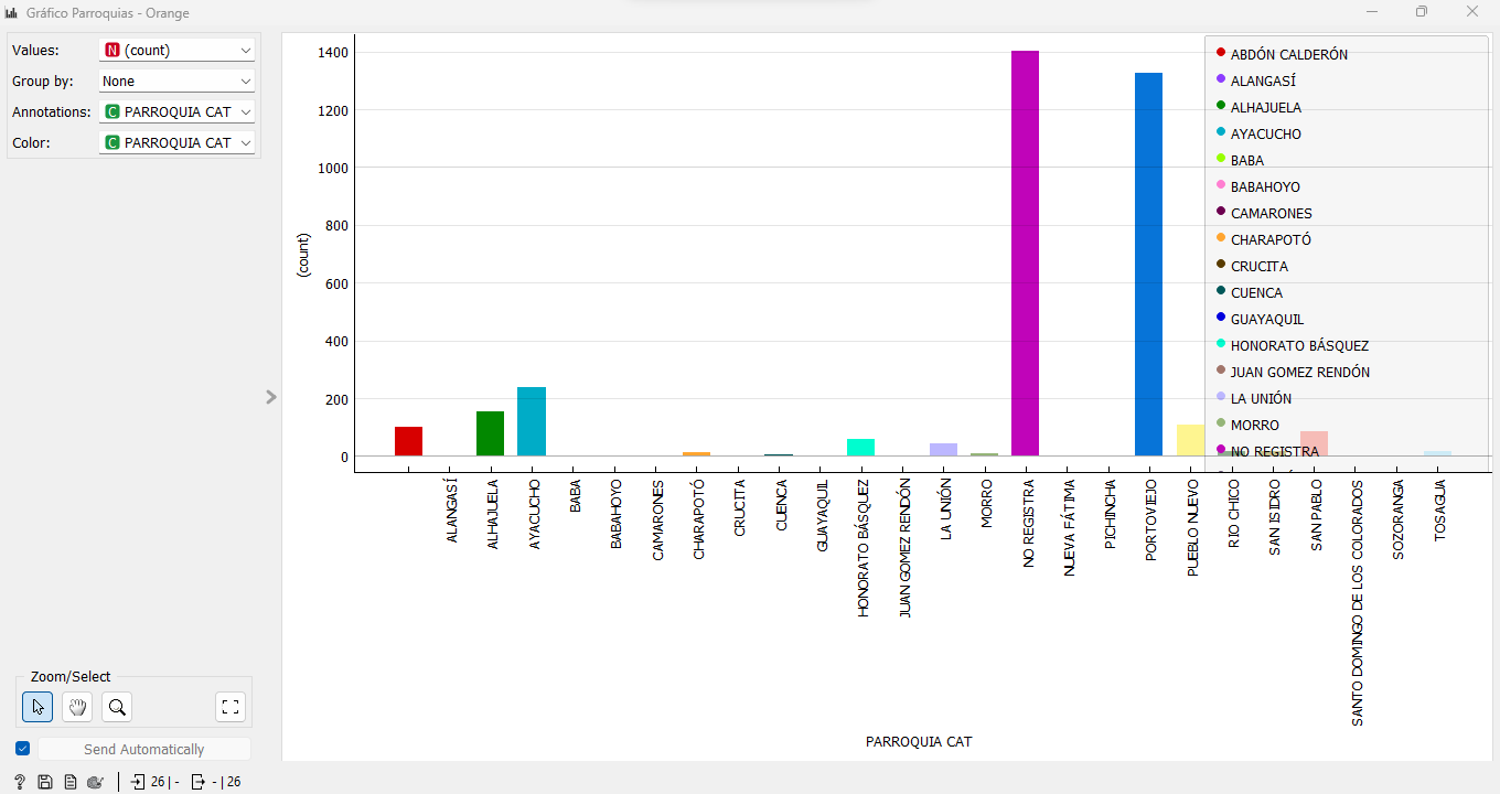 Al respecto, se consideró pertinente realizar un análisis por parroquias, factor importante al momento de realizar el modelo predictivo, para conocer en las que hubo mayor concentración de casos COVID-19. La figura 5 expone estos resultados, observándose que en la Parroquia de Portoviejo (color azul) está la mayor concentración de casos en comparación con otras parroquias. El color fucsia no registra de qué parroquia proceden los pacientes, por lo que estos datos no son relevantes para el análisis.
