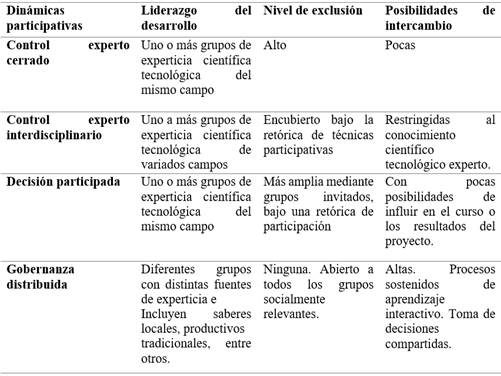Siguiendo la línea de pensamiento de los autores citados, estos grupos sociales relevantes requieren ser identificados mucho antes de poner en práctica cualquier proyecto, y de igual forma estudiar los posibles cambios en las variables participativas a lo largo del tiempo, lo cual unido a la dimensión de las modalidades de participación, los lleva a proponer la existencia de cuatro dinámicas participativas, cuyas particularidades se muestran en la tabla 1.