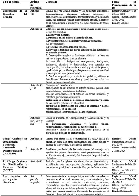 Nota. Estas normas fomentan la promoción de diversas actividades organizativas, participativas y de control social que la sociedad emprende de manera voluntaria para abordar sus problemas y tener influencia en la gestión de asuntos que afectan al bienestar general, las mismas que fueron tomadas en consideración para el Plan Portoviejo 2035.