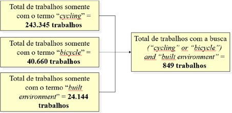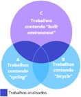 Primeiramente, realizou-se pesquisas preliminares na base de dados pelos termos “cycling”, “bicycle” e “built environment” isoladamente a fim de averiguar os resultados encontrados referentes à cada termo separadamente. Em seguida, a estratégia completa da busca utilizou a seguinte sintaxe: (“cycling” or “bicycle”) and “built environment”. Neste comando de busca utilizou-se o conectivo or para abranger tanto os trabalhos que citam o termo cycling quanto bicycle e o conectivo and para analisar os trabalhos que se encontram na interseção entre a união dos dois termos anteriores e o termo built environment. A figura 1 mostra um diagrama de Venn, utilizado para representar graficamente conjuntos e suas operações básicas, que exemplifica o método de seleção dos estudos analisados: