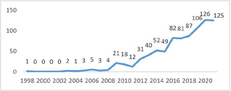 A pesquisa retornou 849 trabalhos, publicados entre 1998 e 2021, envolvendo 2.263 autores e 178 fontes. A idade média dos trabalhos é de aproximadamente 5 anos e ao todo, foram utilizadas 2024 termos-chaves. Ao longo do período analisado, pode-se perceber na figura 3 que houve uma tendência crescente no número de artigos publicados com os temas pesquisados, com uma taxa anual de crescimento de 23,36%, atingindo seu pico em 2020 com 126 artigos publicados, porém mantendo ainda um patamar próximo no ano seguinte, como 125 artigos publicados em 2021. Isso demonstra que os temas analisados estão com maior interesse em publicações dos periódicos.