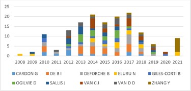 A fim de se quantificar a relevância dos principais autores a partir da quantidade de trabalhos publicados e suas citações, avaliou-se o índice H, que é o número n de artigos que um autor possui com no mínimo n citações. O autor James F. Sallis possui índice H igual a 17, denotando que ele possui 17 artigos publicados que foram citados, no mínimo, 17 vezes. De B. I. possui índice H igual a 16 e Dung Van Do possui índice H igual a 15. Benedicte Deforche possui índice H de 14, David Ogilvie igual 13, Van C. J. igual a 12, Greet Cardon igual a 11, enquanto Hannah Badland (Austrália), Chen P. e Naveen Eluru possuem índices iguais a 10. Ao analisar-se a produção científica ao longo do período analisado, a figura 4 demonstra as quantidades de trabalhos publicados por autor anualmente.