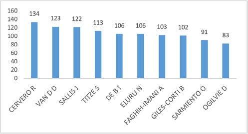 O autor mais relevante na comunidade cientifica, ou seja, aquele que foi mais citado dentre os trabalhos analisados foi Robert Cervero, com seu trabalho “Walking, Bicycling, and Urban Landscapes: Evidence From the San Francisco Bay Area.” de 2003, sendo o mais citado dentre a coleção analisada (total de 517 citações). A maioria dos autores que mais produziram sobre os temas foram dos E.U.A., da China, do Canadá, ou de países europeus, como Bélgica, Reino Unido, Holanda, entre outros, o que confirma que os países desenvolvidos estão na vanguarda dos estudos sobre a temática.