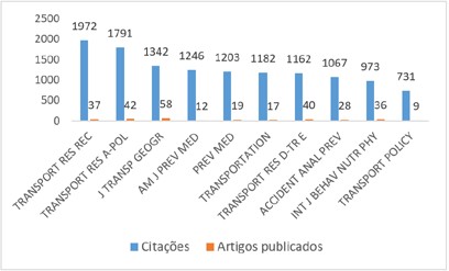 Isso demonstra que os temas de ciclismo, bicicleta e ambiente construído têm sido publicados majoritariamente por periódicos com temas relacionados a transporte e saúde pública. Vale ressaltar que a maioria dos periódicos são oriundos de países desenvolvidos, apenas tendo sido encontrado como algum periódico da América Latina a Revista “Eure- Latinoamericana De Estudios Urbano Regionales” com 1 trabalho publicado. Aponta-se que divulgar artigos com foco selecionado possa intensificar a visibilidade dos periódicos da América do Sul, principalmente se observarmos os resultados da revista Transport Policy que publicou 9 artigos, que obtiveram a excelente repercussão de 731 citações. Desenvolver a temática na América do Sul pode trazer mais visibilidade para os projetos de ambiente construído da região, bem como sua relação com aspectos da mobilidade sustentável e sistemas de transporte.
