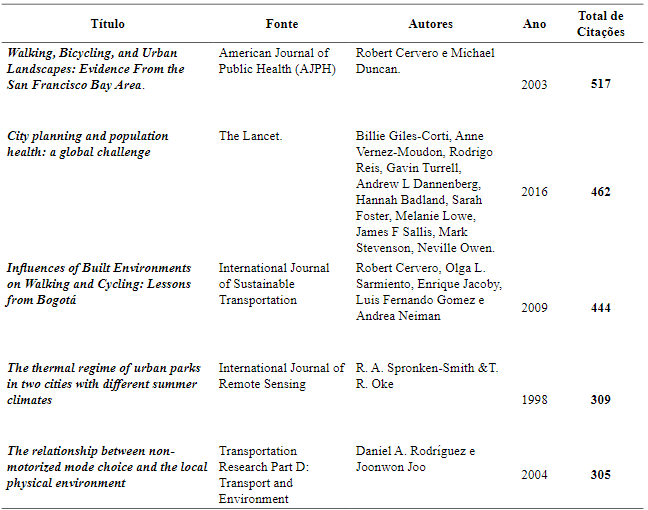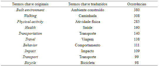 Analisando-se os trabalhos mais citados dentre a base de dados analisadas e os periódicos nos quais eles foram publicados, notou-se que a grande maioria estava atrelada aos temas de transporte, mobilidade, urbanismo, exercício/atividade física, saúde e bem-estar. Isso se demonstrou mais fortemente ao se analisar os termos-chaves mais citados nos trabalhos, que foram “ambiente construído”, “caminhada”, “atividade física”, “transporte” e “viagem”, todos bastante correlacionados entre si.