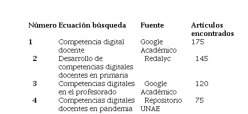 a. Criterios de inclusión, al momento de realizar la investigación se tomó en consideración los siguientes aspectos:a) publicaciones efectuadas en los últimos cinco años 2023, 2022, 2021, 2020, 2019; b) revistas que tengan rigor científico, es decir, que sean indexadas 3) la población de análisis deben ser docentes del contexto latinoameri-cano 4) El grado que ejercen las labores las personas investigadas, corresponde a educación primaria 5) Idioma español 6) Área de investigación. Mientras que los criterios de exclusión son: 1) literatura no científica, 2) docentes de niveles de educación superior, 3) Literatura con fecha menor al año 2019.