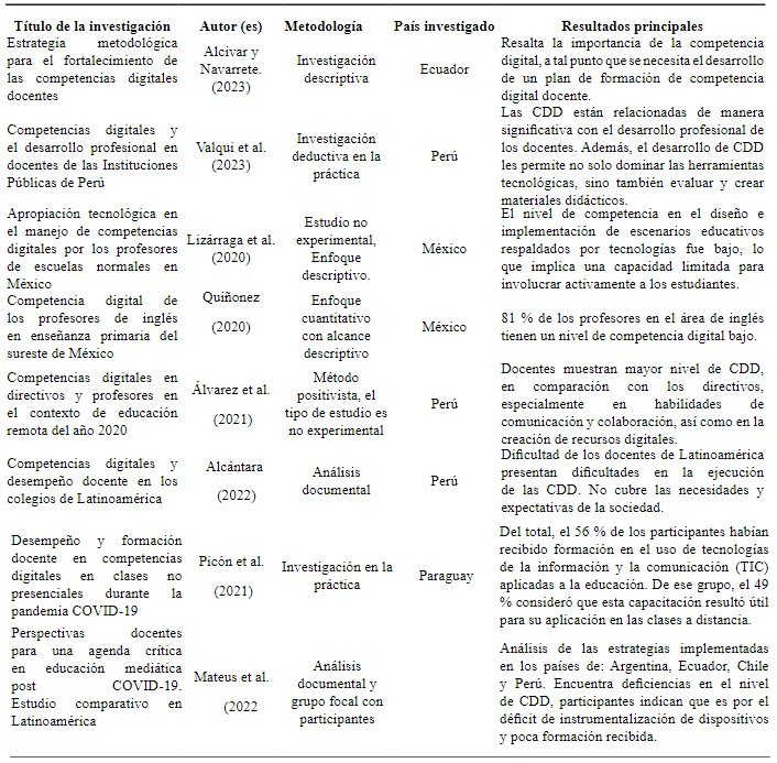 Los estudios revisados destacan la importancia de las competencias digitales docentes en el desarrollo profesional de los educadores en Latinoamérica, pero sobre todo, se evidencia la necesidad de fortalecerlas a través de planes de formación específicos. En países como México, Ecuador y Perú, se destaca la importancia de la competencia digital y la necesidad de implementar un plan de formación para mejorar estas habilidades y se encontró una relación significativa entre las competencias digitales docentes y el desarrollo profesional de los docentes, enfatizando la importancia de dominar herramientas tecnológicas y crear materiales didácticos.