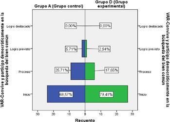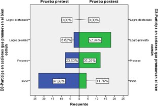 De acuerdo a la figura 5, en relación a la dimensión 3, al grupo experimental en el pretest se obtuvo que un 67.65% de estudiantes se encuentran en inicio; un 23.53% en proceso y un 8.82% en logro previsto; mientras que en el postest se tiene la evidencia que un 11.76% se encuentra en inicio; un 35.29% en proceso y un 52.94% en logro previsto. A nivel de los estudiantes de secundaria se debe propiciar la participación como parte del proceso de aprendizaje en la que se promueva la motivación del ejercicio ciudadano y respeto del bien común entre los educandos y la comunidad educativa.