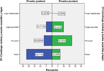 De acuerdo a la figura 3, en relación a la dimensión 1, al grupo experimental en el pretest se obtuvo que un 64.71% de alumnos se encuentran en inicio; un 59% en proceso y un 14.71% en logro previsto; mientras que en el postest se tiene la evidencia que un 20.59% se encuentra en inicio; un 50.00% en proceso y un 29.41% en logro previsto. Es decir, la construcción de normas de conducta es esencial para el desarrollo de los educandos promoviendo acciones que se reflejen en el buen trato y respeto entre personas y comunidad educativa.