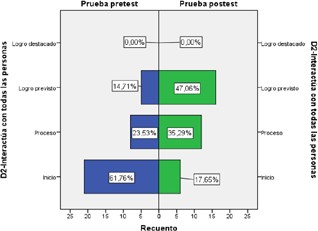 De acuerdo a la figura 4, en relación a la dimensión 2, al grupo experimental en el pretest se obtuvo que un 61.76% de estudiantes se encuentran en inicio; un 23.53% en proceso y un 14.71% en logro previsto; mientras que en el postest se tiene la evidencia que un 17.65% se encuentra en inicio; un 35.29% en proceso y un 47.06% en logro previsto. Es decir, la interacción es un factor primordial en el proceso educativo respetando las ideas ajenas y demostrando un comportamiento óptimo para una sana convivencia y correcta participación.