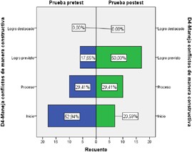 De acuerdo a la figura 6, en relación a la dimensión 4, al grupo experimental en el pretest se obtuvo que un 52.94% de estudiantes se encuentran en inicio; un 29.41% en proceso y un 17.65% en logro previsto; en tanto que en el postest se tiene la evidencia que un 20.59% se encuentra en inicio; un 29.41% en proceso y un 50.00% en logro previsto. Es decir, en el proceso formativo se debe dotar de estrategias eficaces para la gestión de conflictos y la búsqueda de solución a situaciones problemáticas del contexto socioeducativo.