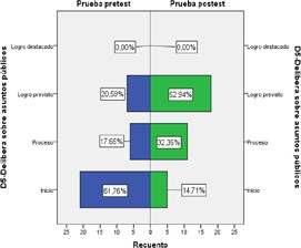 De acuerdo a la figura 7, en relación a la dimensión 5, al grupo experimental en el pretest se obtuvo que un 61.76% de estudiantes se encuentran en inicio; un 17.65% en proceso y un 20.59% en logro previsto; mientras que en el postest se tiene la evidencia que un 14.71% se encuentra en inicio; un 32.35% en proceso y un 52.94% en logro previsto. Es decir, tener una capacidad de expresar ante el público situaciones que atañe a la comunidad educativa, expresando a través de propuestas viables sustentadas sobre la base de razonamientos éticos y de participación democrática.