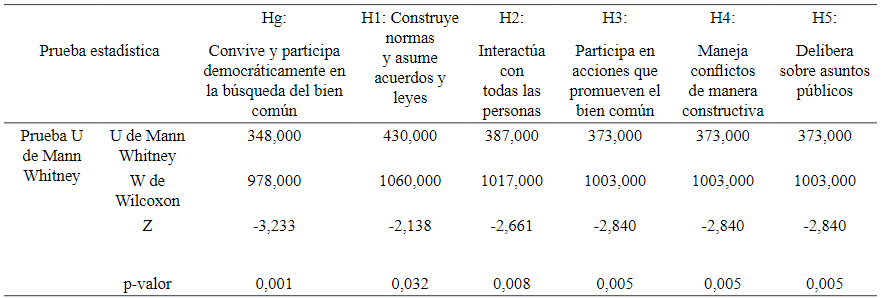 En ese orden de ideas es importante realizar un análisis reflexivo acerca de la construcción de normas de convivencia asumiendo acuerdos y respetando las leyes que incide directamente en la formación integral del educando (p=0.032<0.05). Para ello se requiere la interacción con las personas sobre la base del respeto y una convivencia armoniosa (p=0.008<0.05). Teniendo en consideración que la participación activa se encuentra articulada a promover el bien común en la comunidad educativa (p=0.005<0.05). Con respecto al manejo de conflictos es necesario potenciar esta capacidad en los estudiantes y dotar de estrategias de prevención de violencia en la escuela (p=0.005<0.05). Finalmente, la deliberación sobre cuestiones de carácter público es tan necesario y tomar un punto de vista para la mejor comprensión de la problemática del contexto socioeducativo (p=0.005<0.05).
