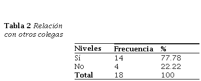 Estos resultados demuestran el desinterés que muestran algunos docentes con respecto a la producción académica, lo cual afecta el número de publicaciones registradas en una universidad y no le permite ubicarse entre las universidades peruanas con más publicaciones a nivel nacional. La Tabla 2 muestra los docentes que establecen relaciones con otros colegas para realizar publicaciones científicas o trabajar en asesorías. Al igual que en el caso anterior, un alto porcentaje de los docentes (77.88%) establece relaciones con otros compañeros; mientras que otro pequeño porcentaje (22.22%) no lo hace, revelando un clima laboral regular en la universidad en cuestión.