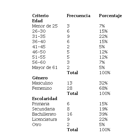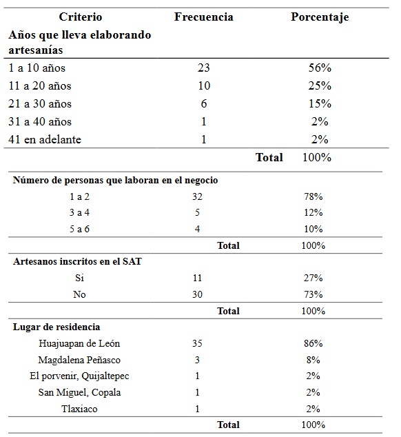 A partir del análisis de la información, se identificó que el 22% de los artesanos se encuentra en un rango de edad entre los 31 a 35 años, seguido por un 15% que tienen entre 26 a 30 y 36 a 40 años. En cuanto al género, se identificó que el 68% de las personas que se dedican a esta actividad son mujeres, además de que el 39% cuenta con bachillerato, el 21% cursó una licenciatura, y únicamente el 6% tiene nivel de instrucción primaria, además de que dos artesanos mencionaron que cursaron una carrera técnica (ver tabla 1).