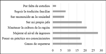 Dentro de las razones por las que se han mantenido en esta actividad, se identificó que principalmente es por mejorar su nivel de ingresos y mantener la cultura de la región; la información anterior evidencia que los artesanos desarrollan esta actividad por gusto y para generar ingresos por medio de la preservación de la cultura. No obstante, algunos encuestados manifestaron que la razón es por la falta de estudios (ver figura 2).