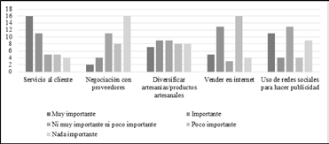 Respecto a los conocimientos que consideran los artesanos deben mejorar para comercializar sus productos, señalan que es necesario fortalecer el servicio al cliente y utilizar redes sociales para publicitar sus artesanías y, de menor importan- cia, abordan la negociación con proveedores (ver figura 3).