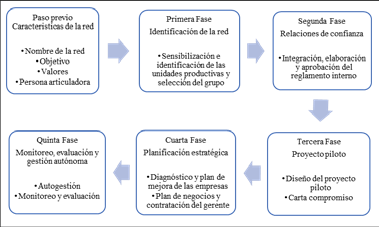 A partir de la revisión de la literatura y del análisis de la información obtenida a partir de la encuesta, se integró la propuesta de una red empresarial para impulsar el crecimiento organizacional de los artesanos de la región Mixteca Oaxaqueña, esta se basa en la metodología creada por la Organización de las Naciones Unidas para el Desarrollo Industrial [ONUDI] (2008), la cual consta de cinco fases: la identificación de la red, que consta de sensibilizar e identificar a las empresas; generar relaciones de confianza, donde se integran las empresas y se genera el reglamento; la generación del proyecto piloto, se diseña la red y la carta compromiso; la planificación estratégica, se hace un diagnóstico, un plan de mejora y de negocios y se contrata al gerente, por último; el monitoreo, evaluación y gestión autónoma, se evalúa la autogestión y se monitorea y evalúa la red (ver figura 4), debido a que las demás involucran la implementación de la idea.