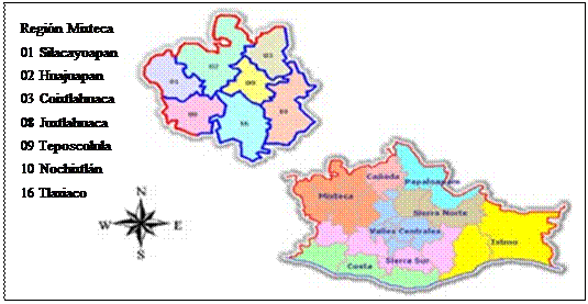 La región Mixteca se encuentra ubicada al noroeste del estado de Oaxaca, cuenta con 496,601 habitantes y está integrada por 155 municipios divididos en siete distritos: Silacayoapan, Huajuapan, Coixtlahuaca, Juxtlahuaca, Teposcolula, Nochixtlán y Tlaxiaco (ver figura 1). El municipio con mayor presencia es Huajuapan de León, es la cabecera municipal de la región; las principales actividades económicas, son el comercio y servicios directos, los cuales en conjunto ocupan el 80.5% de participación; seguido de las actividades secundarias, con minería, industrias manufacturas y electricidad que tiene el 19% de participación (Coordinación General del Comité Estatal de Planeación para el Desarrollo de Oaxaca, [COPLADE], 2022).