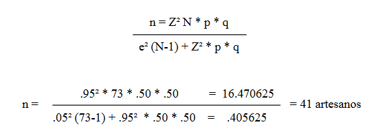 En la determinación de la población se utilizó la información proporcionada por el Honorable Ayuntamiento de la ciudad de Huajuapan de León, además de una base de datos del Instituto Nacional de los Pueblos Indígenas (INPI). El total de artesanos cuantificados en ambas bases de datos después de analizar la información dio como resultado un total de 73. Para el cálculo de la muestra se utilizó la ecuación de poblaciones finitas (Hernández-Ávila y Capio, 2019), donde el intervalo de confianza de Z es 95%, con un error de estimación del 5%, con una probabilidad a favor de p= 50% y una probabilidad en contra de q = 50%, obteniendo una muestra de 41 artesanos.