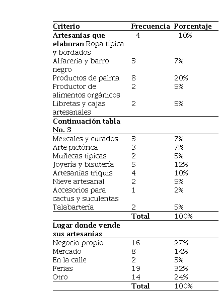 En relación con las artesanías que elaboran los encuestados, se encontró que los productos de palma tienen mayor presencia con un 19%, seguidos de joyería con 12%; ropa típica y bordados únicamente un 9%. En cuanto al lugar donde venden sus artesanías, el 32% refiere que, en ferias, el 27% tiene un local propio, mientras que el 23% señaló que no tiene un lugar fijo, y únicamente utiliza el internet como medio para vender sus productos (ver tabla 3).
