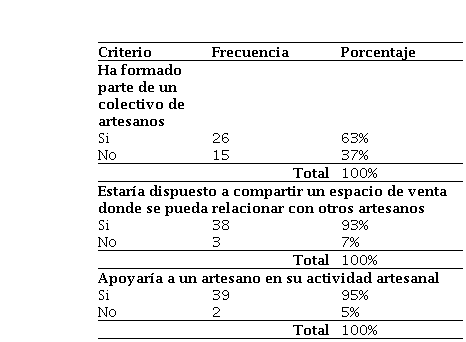 Abordando el tema de redes empresariales, las primeras preguntas que se plantearon fueron respecto a la solidaridad y trayectoria dentro de su actividad. El 63% de los encuestados ha formado parte de un colectivo y el 92% menciona que estaría dispuesto a formar parte de un grupo donde se relacionen con otros artesanos. En lo que respecta al apoyo y asesoría, el 95% está dispuesto a apoyar a otros artesanos para que fortalezcan su actividad (ver tabla 4).