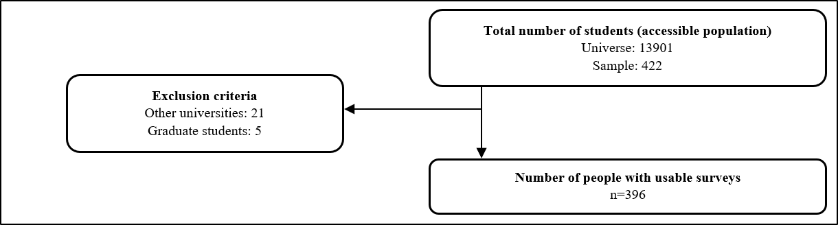 Following the associative paradigm1, this research is correlational, collecting non-changing data, retrospective and cross- sectional, capturing one-time population characteristics. About the unit of analysis, around 1,299,251 undergraduates exist in Peru, 4.2% of the total population (Superintendencia Nacional de Educación Superior Universitaria [SUNEDU], 2022). In Lima, with high COVID-19 cases, 48% of 17-25-year-olds attend university (Instituto Nacional de Estadística e Informática [INEI], 2017). This study focuses on Lima’s Universidad Nacional Mayor de San Marcos (UNMSM), established in 1551, the city’s largest national university, where students are connected to various regions through socio- demographic ties. (Burga, 2019; Giraldo, Díaz & Calderón, 2019; Lynch, 1990; UNMSM, 2007). Out of 13,901 UNMSM enrollees (SUNEDU, 2022), a simple random sample of 418 was obtained with a 5% margin of error and 95% confidence. However, the non-probabilistic sampling method was used, involving virtual distribution through social networks, email, and WhatsApp groups, with a 10% increase to account for potential loss or rejection (Figure 1).