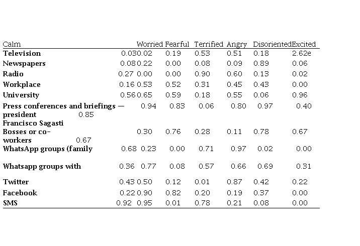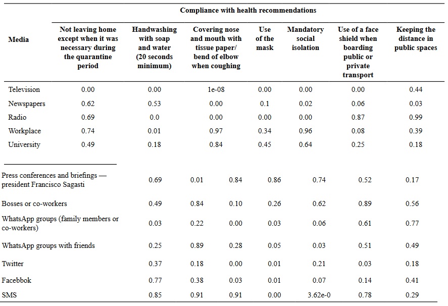 At the correlational level between dimensions of the variables, we can see that the association between categories of the variables “compliance with health recommendations” and “effects of media” shows that the impact of television is negatively and yet weak correlated with all dimensions of the former variable except “keeping the distance in public spaces”. Similarly, the impact of newspapers is weakly and negative significantly correlated with compliance in “handwashing with soap and water” (0,00), “mandatory social isolation” (0,02), and “keeping the distance in public spaces” (0,03). Radio also exhibits weak and negatively significant correlations with “handwashing with soap and water”, “covering nose and mouth when coughing”, “use of masks”, and “mandatory social isolation” (0.00 for each). Messages sent via WhatsApp groups (family members or co-workers) similarly maintain significant yet weak and negative associations with various compliance measures, including not leaving home except when necessary (0,03), “covering nose and mouth when coughing” (0,00), “use of masks” (0,03), and “mandatory social isolation” (0,06). Similar patterns are observed with WhatsApp groups with friends, which exhibit a negative and weak association with compliance with social isolation measures (0,03). In contrast, messages in workplace settings show only weak correlations with “handwashing with soap and water” (0,01). Regarding digital social media, correlations were consistently negative, with Twitter messages significantly impacting “handwashing with soap and water” (0,00), “covering nose and mouth when coughing” (0,01), and “use of masks” (0,03), while Facebook information significantly influenced these latter two dimensions (0.03 and 0.01 respectively). Finally, text message information exhibited weak negative correlations with “covering nose and mouth when coughing” (0,03), “use of masks” (0,00), and “mandatory social isolation” (0,00). Significant correlations between the dimensions of the variables “emotional impact” and “effect of the media” indicate that “worried” had a significant, albeit weak, impact with television (0.02) and radio (0.00) information, while “fearful” was weakly associated with newspaper (0.00) and radio (0.00) information, as well as with WhatsApp groups (family members or co-workers) (0.00) and SMS (0.01). Moreover, the emotion of “disoriented” also showed a weak significant relationship with the WhatsApp group with family. Finally, the emotion of “excited” was the most significantly associated with various sources of information: positively with messages in the workplace (0.00) and negatively with messages from TV (0.00), radio (0.02), WhatsApp groups (family members or co-workers) (0.00), Facebook (0.00), and SMS (0.00).