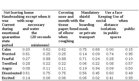 Finally, significant correlations between the dimensions of the variables “compliance with health recommendations” and “current emotional state” consistently demonstrated weak associations, indicating that being “calm” is positively associated with “use of the mask” (p=0.00), while being “excited” is associated with “mandatory social isolation” (p=0.02).