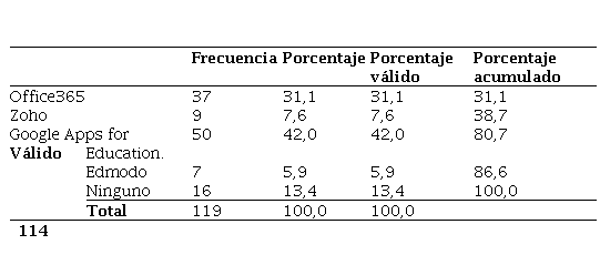 Los resultados de la encuesta muestran que Google Apps for Education es la herramienta más utilizada para el trabajo colaborativo, seguida por Office365. Es relevante destacar que el porcentaje acumulado de estas dos herramientas representa el 73.1% del total de respuestas, lo que sugiere que son las opciones más populares para el trabajo colaborativo entre los encuestados.