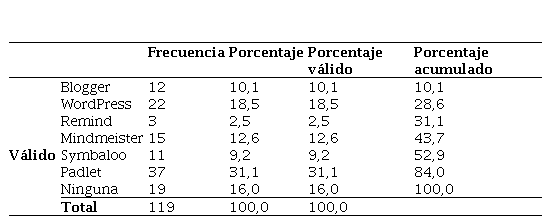 Los resultados de la pregunta muestran que Padlet es el recurso más utilizado para comunicarse, debatir y colaborar entre los estudiantes, seguido por WordPress y Mindmeister. Es relevante destacar que el porcentaje acumulado de estos tres recursos representa el 71.4% del total de respuestas, lo que sugiere que son las opciones más populares para la comunicación, el debate y la colaboración entre los encuestados.
