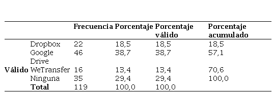 Los resultados de la encuesta muestran que la herramienta más utilizada para compartir archivos en la formación estudiantil es Google Drive, seguida por Dropbox y WeTransfer. Es relevante destacar que el porcentaje acumulado de estas tres herramientas representa el 70.6% del total de respuestas, lo que sugiere que son las opciones más populares para compartir archivos entre los encuestados.