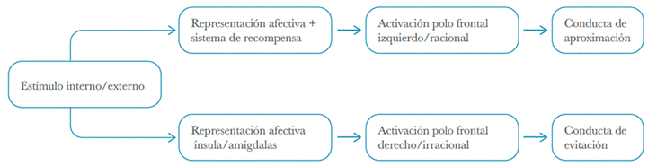 Diversas investigaciones han demostrado, a través de distintos métodos de evaluación, que existe una tendencia al procesamiento de estados afectivos positivos en el hemisferio izquierdo y un predominio del hemisferio derecho para los estímulos de valía afectiva negativa. Es importante mencionar que, además de estudiar la asimetría en el procesamiento emocional, el Dr. Richard Davidson, pionero en el estudio de este tema, concluyó que la actividad de las regiones anteriores del lóbulo frontal izquierdo se vinculaba a conductas de aproximación y abordaje y, por el contrario, la activación de regiones del polo frontal derecho se asociaba a actos de aversión y retirada [11].