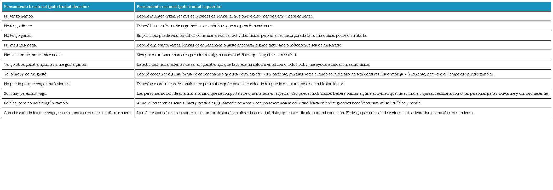 En la Tabla 1 se enumera, a modo de ejemplo, formas de reestructuración cognitiva que permitirían modificar pensamientos irracionales con influencia negativa sobre la realización de actividad física.