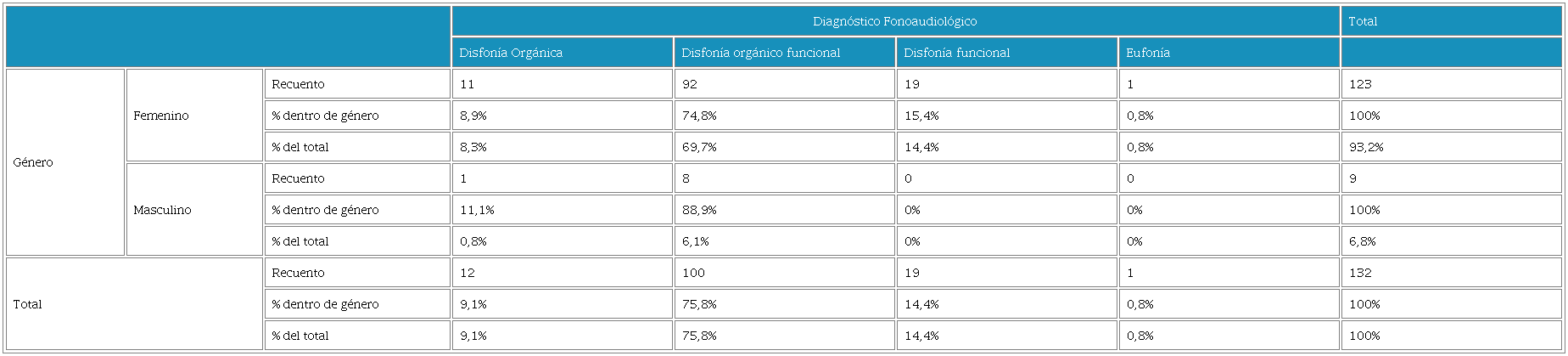 En la tabla 2 se observan 132 datos válidos, hubo 54 perdidos. Como se puede apreciar, la disfonía orgánico funcional presenta un total de 100 docentes diagnosticados. Es equivalente a un 75,8% del total, con 74,8% del género femenino (92 casos) y 88,9% del masculino (8). En segundo lugar, se instala la disfonía funcional con un total de 14,4% (19) del total de diagnósticos, 15% dentro del género femenino y sin hallazgos en el masculino. Por último, la disfonía orgánica se presenta en 9,1% (12) del cual 11 reportes (8,9%) corresponden a mujeres mientras solo el caso de un hombre fue registrado (11,1%).