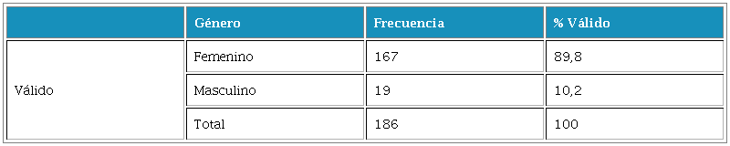 De acuerdo a la tabla 4, de 186 sujetos con queja vocal que se presentaron al IST, las personas de género femenino asisten con mayor frecuencia a consultas, con un total de 167 casos (89,8% del total), mientras que del género masculino hay un total de 19 consultas (10,2% del total).