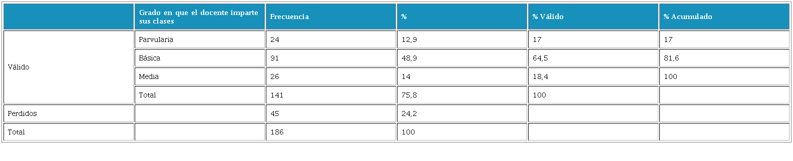 Grado en que el docente imparte sus clases: parvulario, básico, medio y universitario.