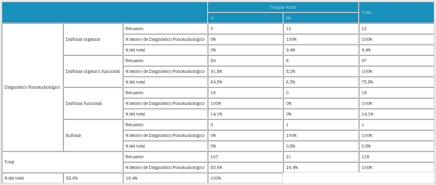 Respecto a la relación existente entre diagnóstico fonoaudiológico y terapia vocal, el diagnóstico más recurrente corresponde a las disfonías de carácter orgánico-funcional, con un total de 91 casos (75,8% del total de consultas), de los cuales 89 (69,5%) fueron derivadas a terapia vocal y 8 (6,3%) no fueron derivadas a terapia vocal dentro de IST. Entre las disfonías de origen funcional, los 18 docentes diagnosticados (14,1% del total de consultas) fueron referidos a tratamiento dentro del IST. Finalmente, ninguna de las disfonías de origen orgánico fue llevada a terapia dentro de IST por no cumplir características de naturaleza exclusivamente laboral; estas últimas correspondían a 12 diagnósticos (9,4%).