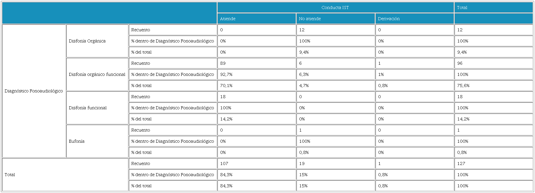 En la tabla 7 se puede observar la relación existente entre diagnóstico fonoaudiológico y conducta IST. Consecuente con el resultado obtenido anteriormente en cuanto a la terapia vocal, se anota que el total de 18 casos (14,2%) de disfonía de origen funcional son atendidos dentro de IST.