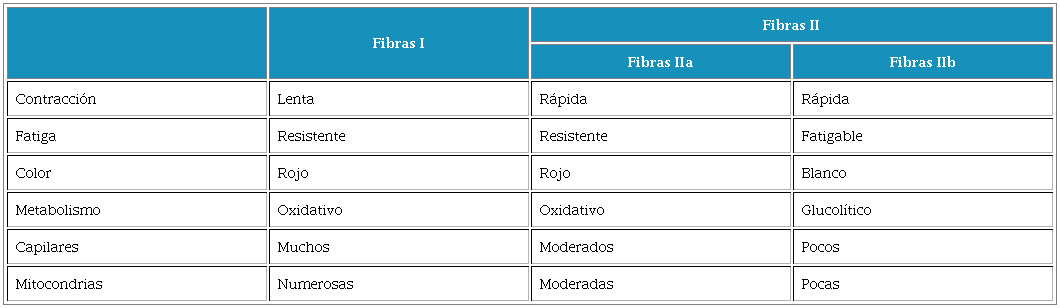 En la totalidad del músculo esquelético pueden encontrarse dos tipos diferentes de fibras: las tipo I (de contracción lenta pero resistentes a la fatiga) y las tipo II (de contracción rápida pero altamente fatigables). Aun cuando todos los músculos estriados poseen una mezcla de ambas fibras, siempre existirá un predominio dependiendo de su función específica; por ejemplo, los párpados cuentan con mayoría de fibras tipo II mientras que las extremidades están compuestas principalmente por fibras tipo I. Como se observa en la Tabla 1, las del primer tipo presentan resistencia a la fatiga debido a una mayor concentración de mitocondrias y de capilares que aportan una cantidad de oxígeno superior en comparación con otras fibras [10]. A su vez, las de contracción rápida se pueden categorizar en tipo IIa y IIb. Las IIb son las más veloces pero son menos eficientes debido a la cantidad de energía necesaria por unidad motora y al metabolismo que emplean para conseguirla. Mientras tanto, aquellas tipo IIa se encuentran en una posición intermedia entre las tipo I y las tipo IIb y se adaptan positivamente ante el entrenamiento; aumentando su capacidad oxidativa [14].